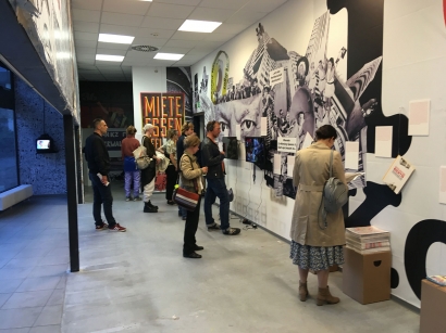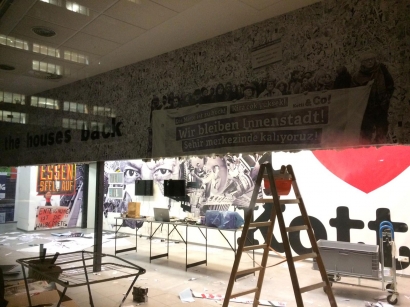 “the wallpaper installation is a reflection by sandy kaltenborn (image-shift, kotti & co, kotti-coop) and stefan endewardt & julia brunner (kotti-shop, superfuture) about their creative practices and strategies in and with the socio-spatial fabric at kottbusser tor – and beyond – up to and including the housing question in berlin. “der kotti ist kein ponyhof” [something like “kotti is not a bed of roses”] develops a visual narrative about what connects it, namely both the connection to urban space, to its themes and neighbourhoods, while also examining the question of how and with what approach one acts and would like to act creatively in it. documentary elements are interwoven with essayistic-narrative reflections and insights into the current situation at kottbusser tor. they overlap like the urban space itself – between participatory art practice, communication design, neighbourhood and communal work as well as between renters’ demos, contract negotiations and a timeless loitering on the steps in front of the buildings. the project “der kotti ist kein ponyhof” is translated as din a5, and continues on, back into urban space as well, but also into the discussion about creative practice in urban spaces.”
