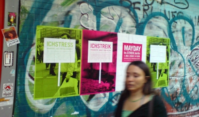 this series of 7 posters (3+3+1) is raises the question of how to strike or pause in our working conditions – in a situation of precarity. how can we go on strike besides getting sick, drinking all night or just burning out? we felt that it was not enough to just share the drama of daily life work stress with our friends or partners in private settings. we wanted to put these questions into the streets, to inscribe them into the public discourses. stress, burnout, job related illness… these are not private issues. the political picket sign is superimposed on background images of daily life, both public (the subway) and private (the bedroom,) playing on the contradiction between of the picket sign (classical demonstration and expression of demands) and daily life (bed, street, transportation.) this is played against by the absurdity of the poster with an empty picket sign. the empty sign opens up the possibility of writing one’s own claims, questions, and anger… but also puts forth the idea that politics is not a “ready made product” but a participatory process. the 3 words below try to raise more questions about the contradictions of living in a market culture. for instance, the question about “solidarity:” how does this work together with career and competition? even though both happen all the time?