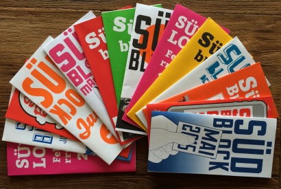 südblock is a event location, cafe, restaurant (and much more) located in berlin kreuzberg – just across the big intersection kottbusser tor, where our studio is located. südblock is a unique space, run by lovely people – who care more about the social than the business. südblock hosts a very wide mix of all kind of different people: neighbors stop for a coffee, queer party-hoppers party, all kind of artists perform, political activists have events, bands play life music and so on… in january of 2012 we started to design the monthly program for südblock. for this we decided not to have a fixed design identity as the space itself is very divers in the first place. every monthly flyer has a poster in the inside.