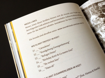 as part of the trans-local school of echoes the sound art group ultra-red together with the berlin based tenant group kotti & co investigated the „co” the neighborhood and the so called „co” of the group. „there are audible emerging fields of action, demands, interest policies, languages and narratives of belonging …” we designed the booklet “the co of kotti & co – a research of organized listening”.